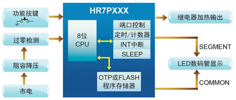 功能說明: ①支持預(yù)約開機(jī)。 ②加熱智能控制。 ③掉電自動(dòng)進(jìn)入低功耗模式。 ④LED屏指示工作狀態(tài)。 | 特征說明: ①通過檢測電源頻率,實(shí)現(xiàn)精確計(jì)時(shí)。 ②I/O可直接驅(qū)動(dòng)LED屏。 ③支持寬電壓:110V~220V。 |
