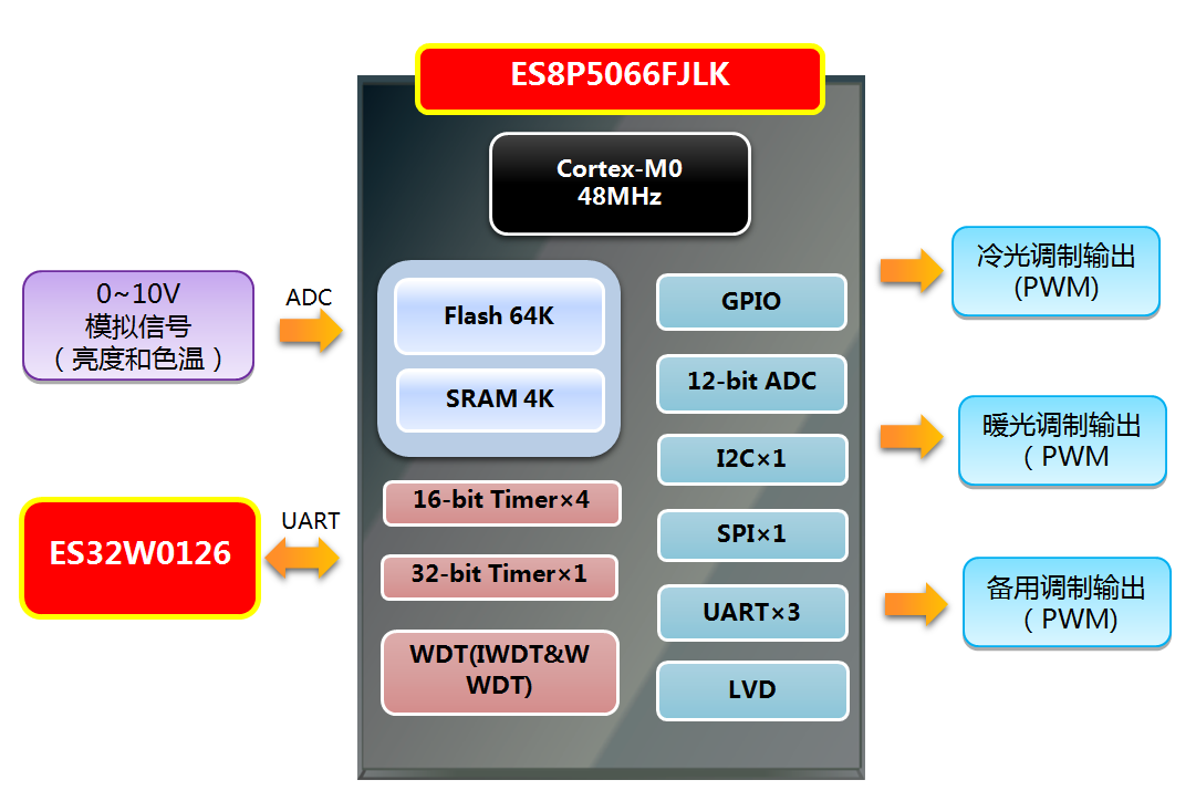 ① LED隔離開(kāi)關(guān)調(diào)光電源 | 特征說(shuō)明: ①具備多路PWM輸出通道,每個(gè)通道可以單獨(dú)配置輸出頻率和占空比 ②3個(gè) 16-bit Timer,具備寄存器緩沖器功能,配合峰值寄存器可以靈活實(shí)現(xiàn)不同頻率的無(wú)縫切換 ③高精度12-bit ADC,提高調(diào)光深度 ④64KB Flash,4KB SRAM ⑤UART×1,終端 APP 調(diào)光 |