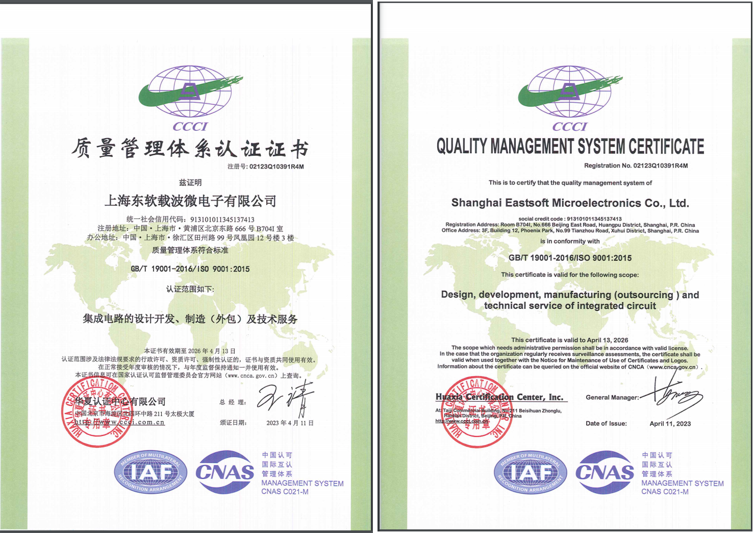 上海東軟載波微電子有限公司依照ISO9001建立管理體系,形成文件,確定質量管理體系的過程, 制定相關準則和方法,保有效運作和監(jiān)控,并持續(xù)改進其有效性。