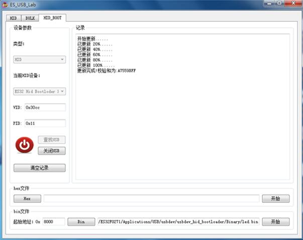 選擇 HID_BOOT 一欄,查找到自定義 HID 設備“ES32 Hid Bootloader Device”。打開此設備,在“bin文件”一欄填入 APP 的起始地址,點擊“bin”按鈕選擇要加載的二進制文件,點擊“開始”按鈕,開始對 MCU 的 Flash 進行更新。 或者點擊“Hex”按鈕選擇要加載的 Hex 文件,點擊“開始”按鈕對 MCU 的 Flash 進行更新。