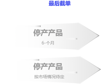 • 基于生產或行業市場變化的考慮,當產品不建議在新的項目中使用時,我司會將長期供貨產品轉為預停產產品。轉入正式停產限用產品前會有6-12個月的緩沖通知期,以利客戶處理與應變。6-12個月后,該產品會轉入停產產品。列入預停產的產品類別,該類產品僅限定于繼續提供給目前使用該產品的既有客戶。